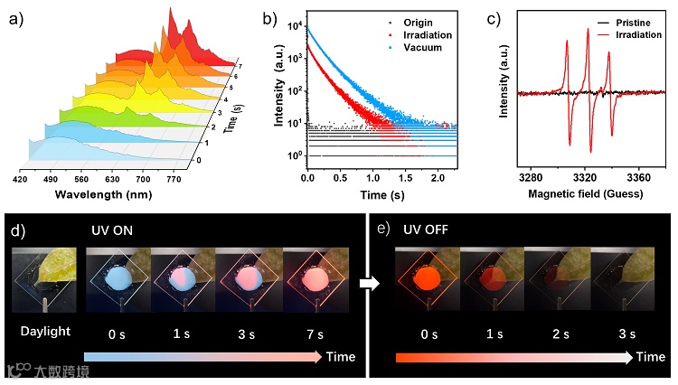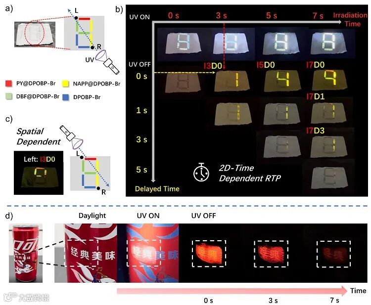 此外,应用DPOBP-Br“三线态引擎的无定形掺杂体系还能实现发光颜色的动态转变。如图4所示,随着光照
