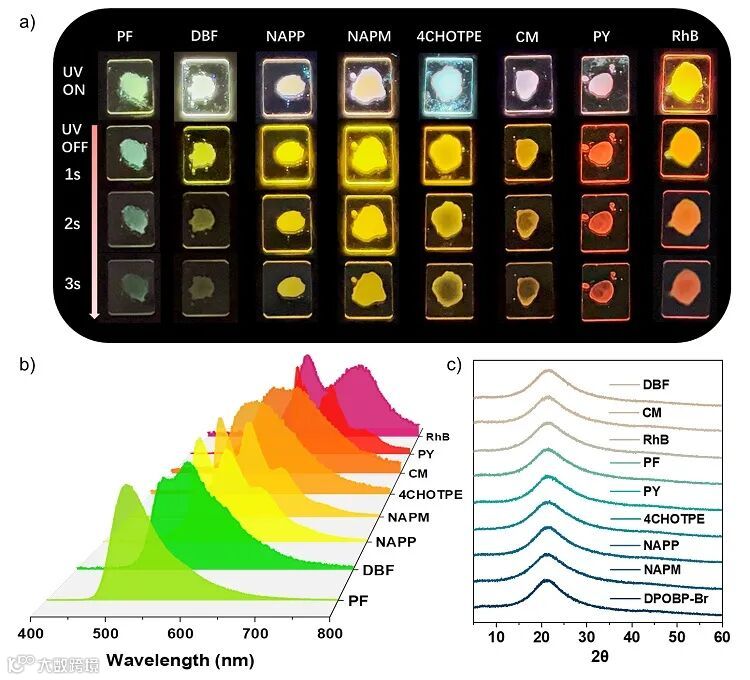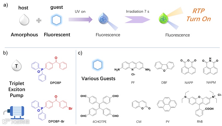 (图1)。该主体不但可以形成连续的透明无定形薄膜,而且可以作为一台“三线态激子引擎”,激活掺杂在其中荧光客体的RTP。将各种类型的商用有机荧光分子(包括分子和离子,ACQ和AIE荧光材料,纯碳氢分子和含杂原子、杂环分子等)按1%的