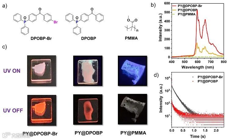 比掺杂到主体DPOBP-Br中,通过简单的加热冷却即可获得室温磷光性能各异的小分子无定形掺杂薄膜(图2)。