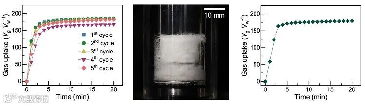 图2. 活性冰的循环使用效果(左)、水合物生成形态(中)以及使用天然雪制作的活性冰的水合物生成效果(右)