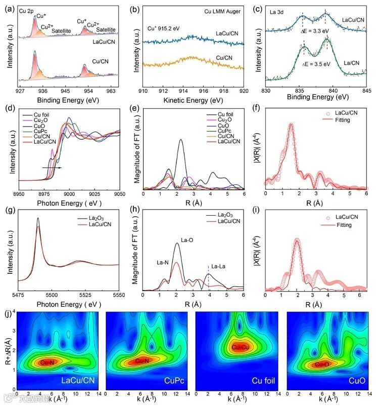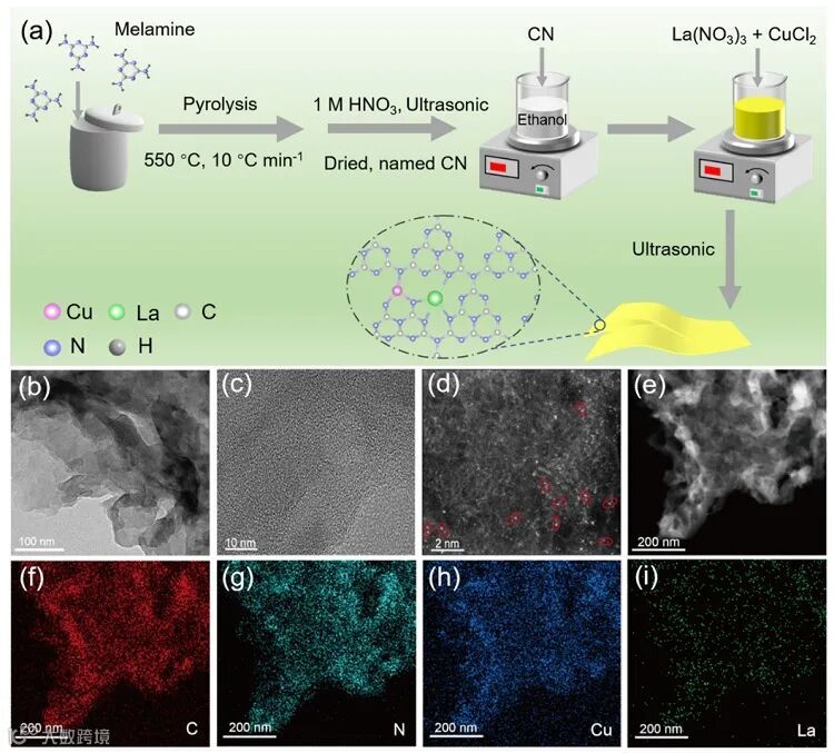 色散谱(EDS)图证实了Cu和La单原子在CN上均匀分布(图1d-i)。