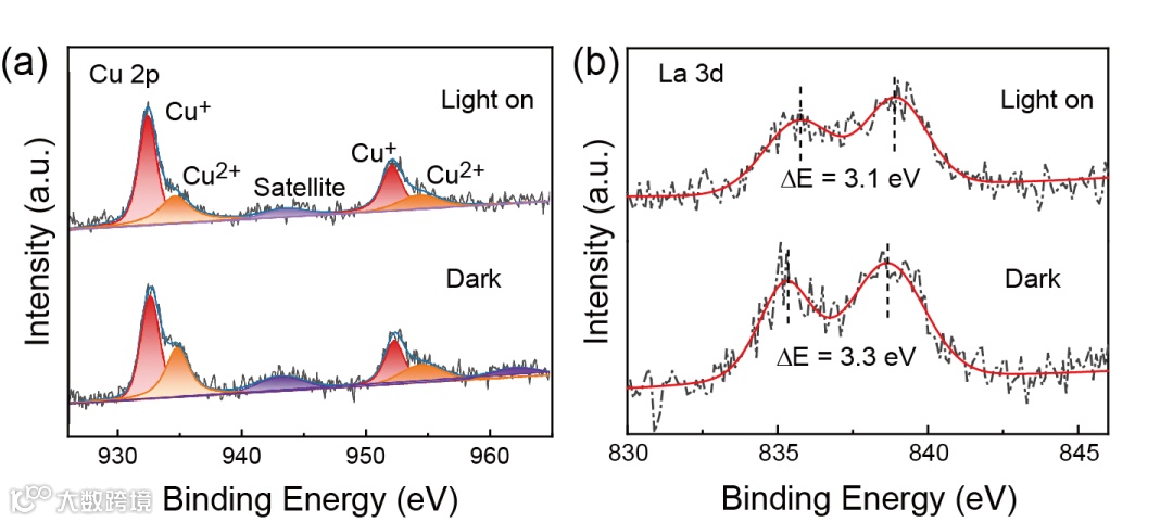 值由0.92增加到1.36,La 3d峰的分裂下降低了0.2 eV(图3)。原位XPS数据表明,光照下原子级Cu-N-La给-受体结构驱动光生电子从La原子向Cu原子转移。