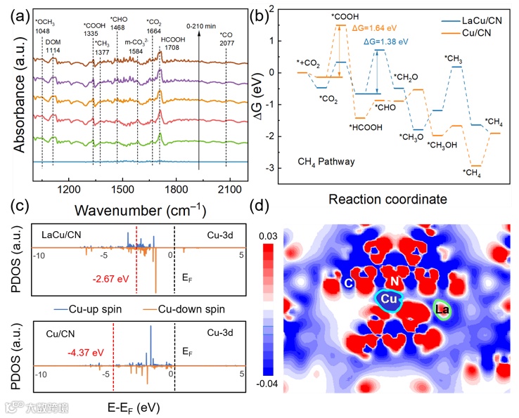 不对称原子级Cu-N-La给-受体结构有效驱动电子从La原子向Cu原子迁移,加速光生电子的转移。La原子的引入改变了Cu单原子的配位环境和电子环境,实现反应中间体吸附能的调制。因此在光还原C