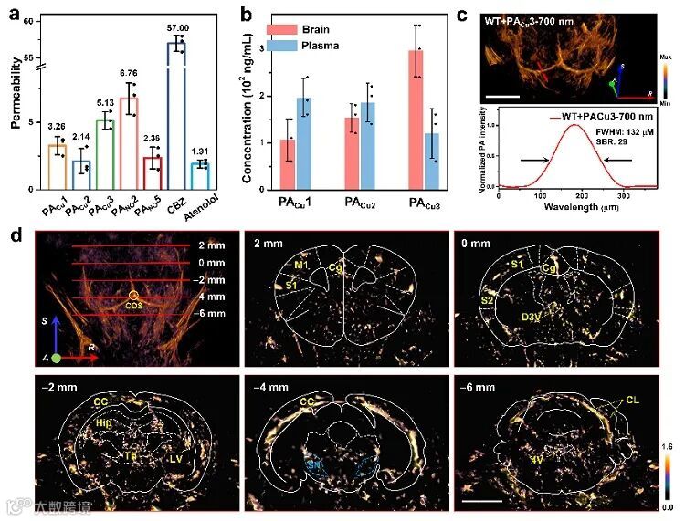作者首先通过脑/血浆探针分配、平行人工膜体外渗透以及野生型小鼠和PD小鼠模型的脑部光声成像实验证明了