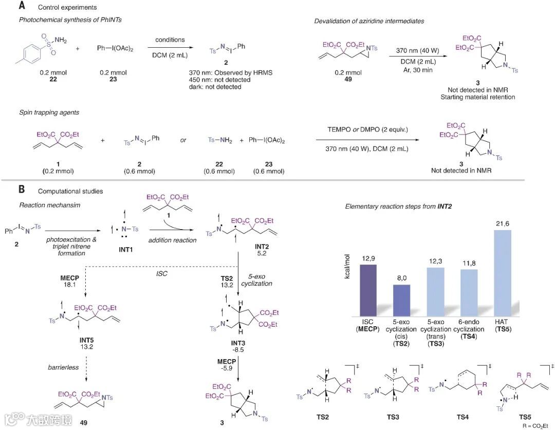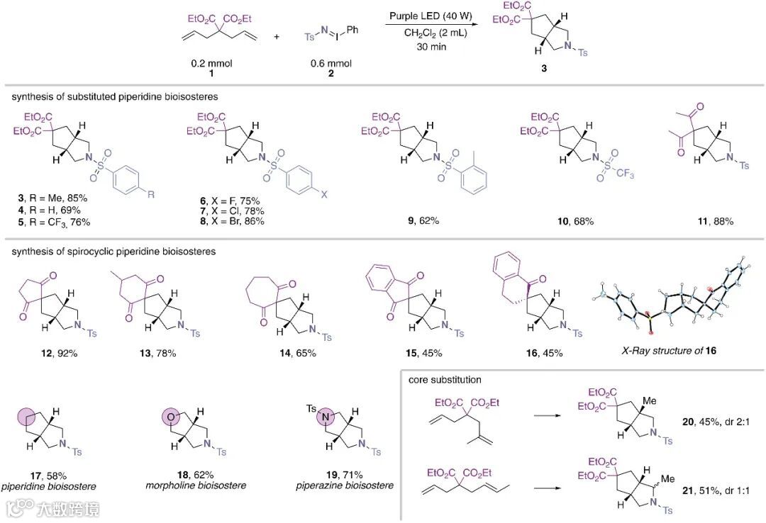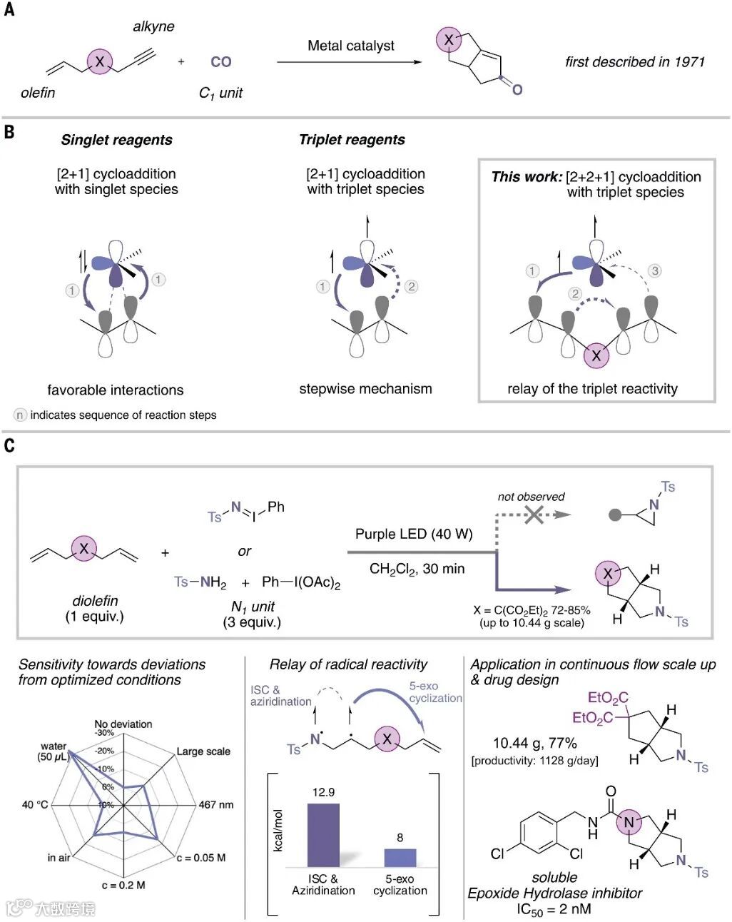 Rene M. Koenigs教授课题组在可见光催化下,实现了氮宾作为N1单元的类Pauson-Khand型环加成反应,成功地构建了一系列常见饱和杂环(如:哌啶、吗啉和哌嗪)的双环生物电子等排体,进而克服了经典Pauson-Khand反应只能用一氧化碳作为C1单元的限制。此外,实验和计算机理研究表明具有三线态双自由基性质的氮宾是反应的关键中间体。