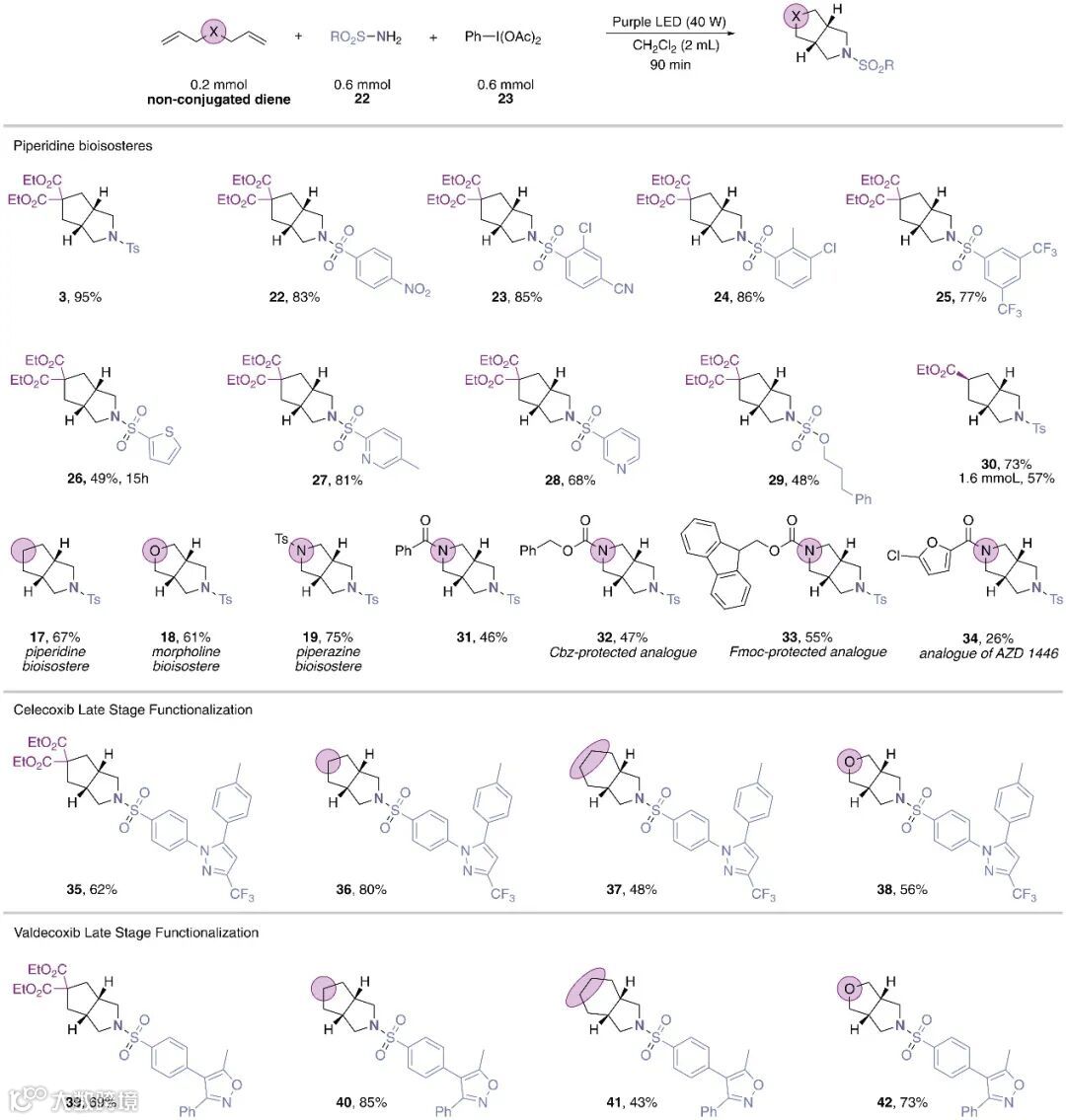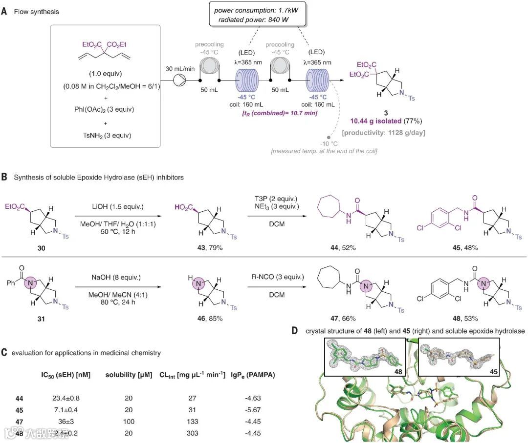 为了实现流动化学合成,作者以DCM和甲醇为二元混合溶剂并采用两个光反应器(每个体积160 mL、840 W LED、365 nm、流速30 mL min -1),而且每个光反应器都配备预冷装置以减少反应混合物的不必要加热。事实上,使用三种试剂的0.08 M预混溶液进行反应时能产生10.44 g(77%)的3-氮杂-双环-[3.3.0]-辛烷3,这相当于每天>1.1 kg的生产力(图4A)。其次,为了评估3-杂氮-双环-[3.3.0]-辛烷作为生物电子等排体的功效,作者将该结构引入两组可溶性环氧化物水解酶(sEH)抑制剂的药效团中(图4B),其中酯基取代的3-氮杂-双环-[3.3.0]-辛烷30经酯基水解、1-丙基膦酸酐介导的酰胺偶联获得酰胺类sEH抑制剂44和45;而不对称保护的3,7-二氮杂-双环-[3.3.0]-辛烷31经脱保护基、与烷基取代异氰酸酯的反应制备了脲基sEH抑制剂47和48。随后,作者对sEH抑制剂的生化性能进行了研究(图4C),具体而言:1)通过监测重组人sEH对荧光底物3-苯基氰基(6-甲氧基-2-萘基)甲酯-2-环氧乙烷乙酸的转化,发现四种化合物均在低纳摩尔浓度范围内显示出高活性和IC50值;2)在DPBS缓冲液(pH 7.0~7.3)中sEH抑制剂在浓度为20-100 μM时达到溶解度极限。在大鼠肝微粒体中,脲基衍生物被迅速降解,而酰胺衍生物的清除率明显较低;3)平行人工膜渗透性试验表明44、47和48的lgPe值较高(渗透性好),而45几乎不透水。由于参数在类药物范围内,上述实验结果共同证明3-杂氮-双环-[3.3.0]-辛烷骨架作为药物化学有用构建砌块的实用性。值得注意的是,作者还通过sEH与45和48的共晶结构来确认它们的结合模式,结果表明这两种配体都以完全占有的方式存在于晶体结构中并且二者位于活性位点内(图4D)。尽管1,3-二氯苯在两个配合物中占据相同的位置,但是45和48之间的碳氮转换似乎导致了tosyl基团的取向明显不同。