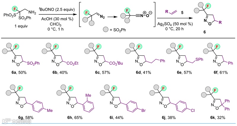 在此基础上,作者进一步研究了单氟重氮乙烷与烯烃的[3+2]环加成反应(图5),一系列缺电子烯烃、未活化烯烃、芳香烯烃、1,1-二取代烯烃等均可与原位生成的单氟重氮乙烷进行[3+2]环加成反应,得到了相应的3-单氟甲基-4,5-二氢异恶唑,产率中等到较好,并具有良好的区域选择性。