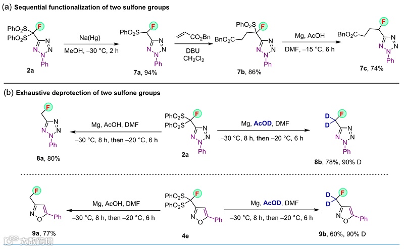 在该反应中,两个苯砜基团的引入不仅显著提高了单氟重氮乙烷试剂的稳定性,而且为后续的合成转化提供了多种可能(图6)。在−30 °C下用钠汞齐在甲醇中处理四氮唑产物时,以94%的产率得到单苯砜基脱除的产物