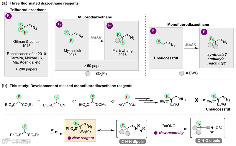 导读:天津大学张发光-马军安团队发现采用二苯砜基作为保护基团可大幅提高试剂的稳定性,顺利实现了“最小”含氟重氮乙烷试剂的合成(图1),并发现该单氟重氮乙烷试剂在环加成反应中呈现出有趣和新颖的反应活性。