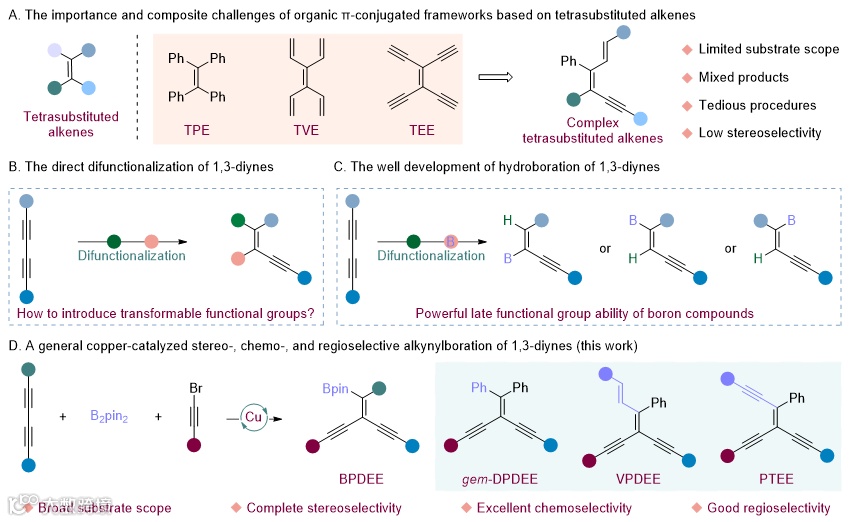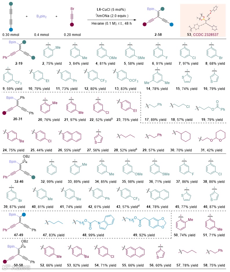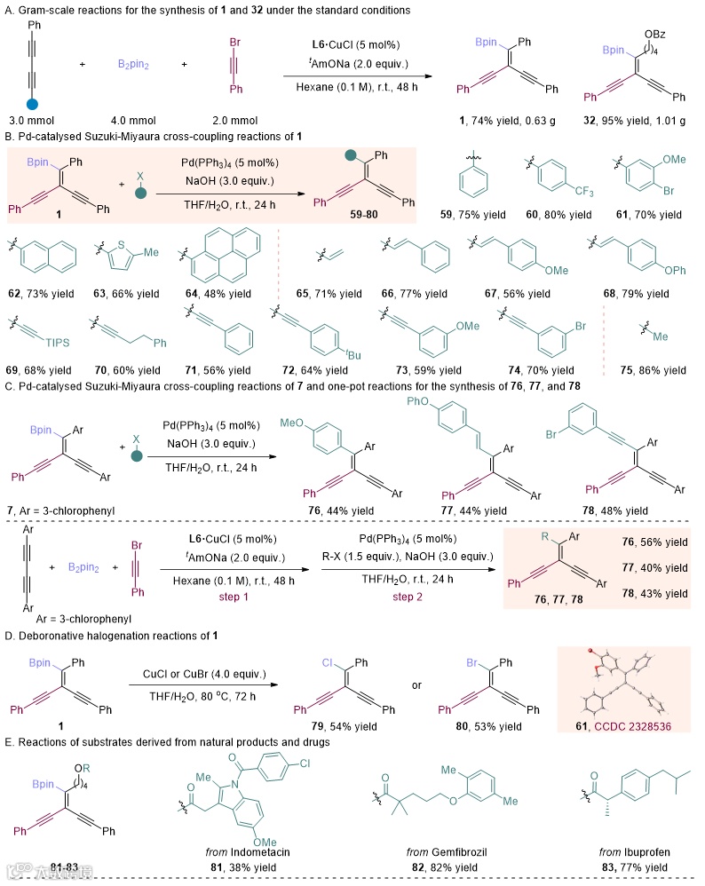 随着各种四取代烯烃的新成员的加入,作者进一步研究了选定的产物1、59、64、66和71的光学性质(图4),对其进行了吸收性质和荧光发光方面的测试(图4A、B)。近年来,有机π共轭骨架的聚集诱导发光(AIE)现象因其在各个领域具有极其重要的应用而逐渐成为研究热点。因此,作者进一步探索了合成的化合物是否具有AIE性质。通过化合物64的荧光发广性质(X射线晶体结构如图4C所示)在不同水配比的乙醇中的测试显示出,随着水份数的增加,化合物64显示出更强的荧光发光(图4D)。当含水量增加到70%时,它大约是纯乙醇溶液中排放强度的8倍(图4F)。这些结果表明化合物64具有AIE性质。随着含水量的进一步增加,发光强度降低,这是AIE聚合物中的常见现象,这个现象形成是由于在高水含量占比下形成了大分子聚集物,从而降低了化合物64的有效浓度(图4E)。综上所述,上述结果表明,这些新型四取代烯烃具有潜在的应用价值。