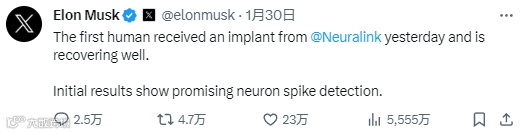 参考文献:[1] Elon Musk推特:https://twitter.com/elonmusk/status/1752098683024220632[2] Neuralink公司官网:https://neuralink.com[3] Even if Elon Musk's Neuralink brain chip never gives us telepathy, it could do wonders for animal testinghttps://www.businessinsider.com/elon-musk-neuralink-animal-testing-benefits-2020-9[4] FULL REVEAL! Elon Musk's Neuralink chip tested live in pig brainshttps://www.youtube.com/watch?v=NqbQuZOFvOQ[5] BBC NEWS: Neuralink: Elon Musk unveils pig with chip in its brainhttps://www.bbc.com/news/world-us-canada-53956683[6] BBC NEWS: Elon Musk's Neuralink 'shows monkey playing Pong with mind'https://www.bbc.com/news/technology-56688812[7] CNN NEWS: Elon Musk’s Neuralink confirms monkeys died in project, denies animal cruelty claimshttps://edition.cnn.com/2022/02/17/business/elon-musk-neuralink-animal-cruelty-intl-scli/index.html[8] Neuralink's brain-computer interface demo shows a monkey playing Ponghttps://www.engadget.com/monkey-mindpong-link-003709524.html[9] Neuralink推特:https://twitter.com/neuralink/status/1681477838958915585[10] Synchron公司官网:https://synchron.com/[11] Elon Musk’s Neuralink hype irks rivals yet shines a light on brain implantshttps://www.ft.com/content/da52aa61-4b9a-435a-aa5c-eaf4c6e01dcb[12] H. Lorach, et al., Walking naturally after spinal cord injury using a brain–spine interface. Nature 2023, 618, 126-133. DOI: 10.1038/s41586-023-06094-5[13] Implanted Brain-Computer Interface (BCI) Devices for Patients with Paralysis or Amputation - Non-clinical Testing and Clinical Considerations | FDAhttps://www.fda.gov/regulatory-information/search-fda-guidance-documents/implanted-brain-computer-interface-bci-devices-patients-paralysis-or-amputation-non-clinical-testing[14] Nature NEWS: Elon Musk’s Neuralink brain chip: what scientists think of first human trialhttps://www.nature.com/articles/d41586-024-00304-4[15] Neuralink: Can Musk's brain technology change the world?https://www.bbc.com/news/health-68169082[16] ABC NEWS: What to know about Elon Musk’s Neuralink brain chip implanthttps://abcnews.go.com/Health/elon-musks-neuralink-brain-chip-implant/story?id=106792141 (本文由小希供稿)