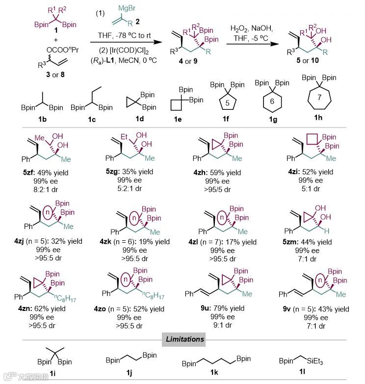 取代的偕二硼酸酯较少应用于不对称催化反应中,特别是双取代的偕二硼烷,由于立体位阻的增大,往往很难和金属作用发生转金属化等基元反应,在体系中易发生脱硼等副反应。令人欣慰的是,如图4所示,多种偕二硼类化合物,包括具有单取代的偕二硼烷可成功地参与该反应(