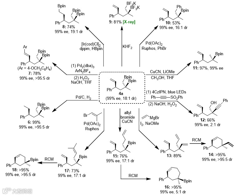 由于产物中含有一个烯烃和两个硼酸酯单元,为分子的进一步转化提供了多个潜在的反应位点。作者通过研究发现,该目标产物可顺利地进行烯烃及2个相邻碳硼键的多种选择性转化,进一步证明了该方法的实用性(图6)。