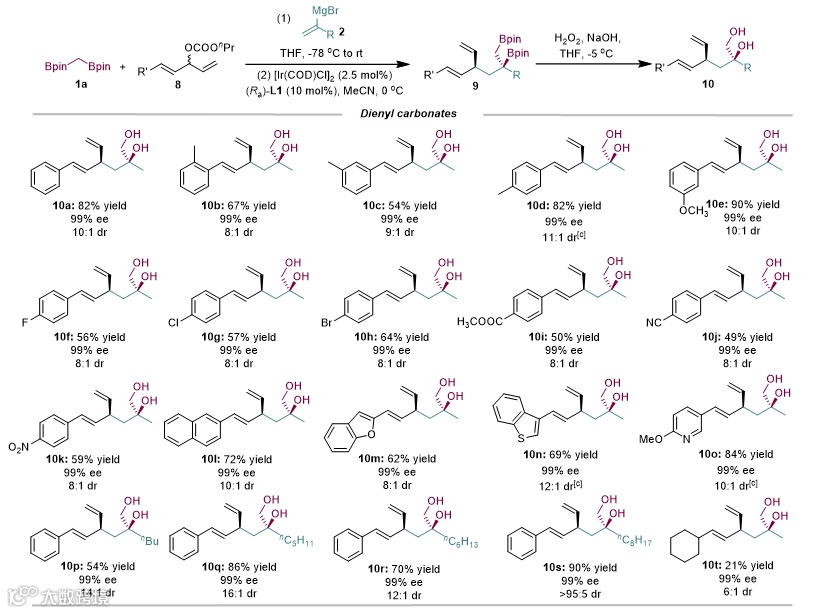 )。其它杂芳基取代的双烯碳酸酯以及不同的乙烯基格氏试剂在标准反应条件下均能取得优秀的反应结果(