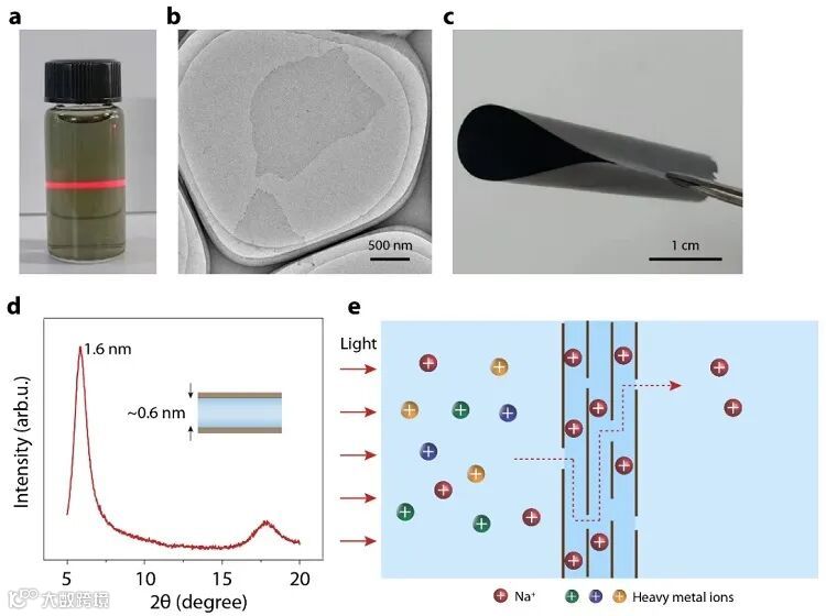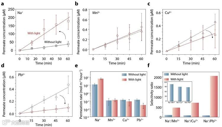 图2. MXene层状膜光增强的钠离子渗透性和选择性。图片来源:ACS Nano