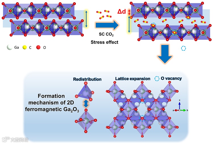 Figure 1. Ultrathin 2D non-van der Waals γ-Ga2O3 with room temperature ferromagnetism was successfully obtained by using supercritical CO2 (SC CO2), which selectively modulates the orientation and strength of covalent bonds in γ-Ga2O3, leading to the change of atomic structure and magnetic property.