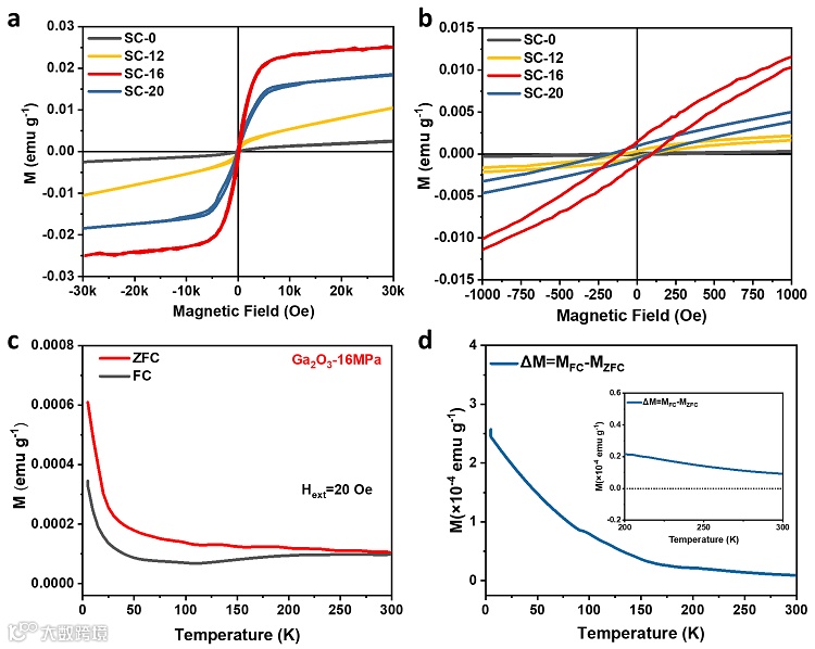 Figure 2. Ferromagnetic characterizations of as-obtained 2D γ-Ga2O3 samples. (a) M–H curve of pristine and SC CO2 treated 2D γ-Ga2O3 nanosheets at 300 K. (b) The corresponding magnified M-H curves near H = 0. (c) FC-ZFC magnetization curve of SC CO2 (16 MPa) treated 2D γ-Ga2O3 (SC-16) in the external magnetic field of 20 Oe. (d) ΔM =MFC−MZFC curve of SC-16.
