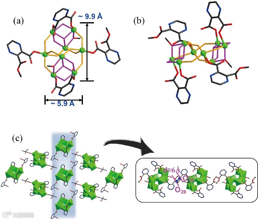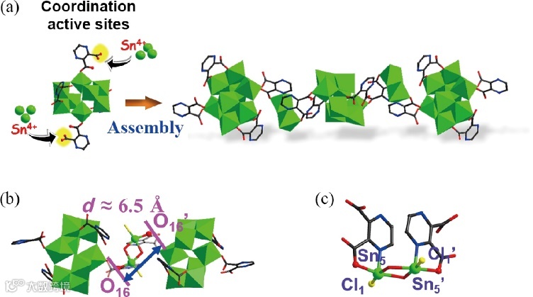 图3. Sn8簇基拓展结构的 (a) 配位驱动组装示意图;(b) 相邻Sn8簇单元上羧基氧原子之间的距离;(c) Sn2簇单元的结构示意图。(为了结构展示清晰,省略了丁基基团。)