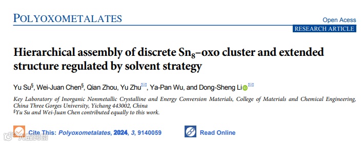 Yu Su, Wei-Juan Chen, Qian Zhou, Yu Zhu*, Ya-Pan Wu, and Dong-Sheng Li*. Hierarchical assembly of discrete Sn8–oxo cluster and extended structure regulated by solvent strategy. Polyoxometalates, 2024, 3(3), 9140059.