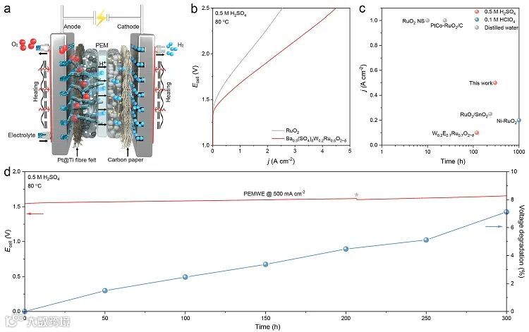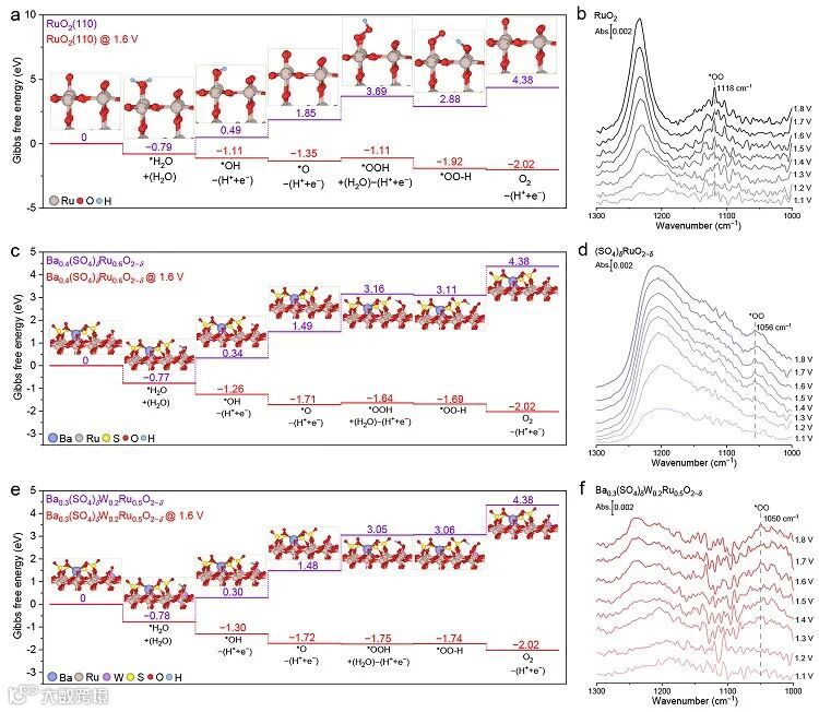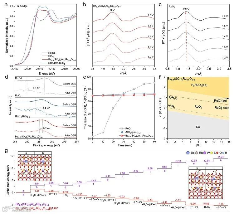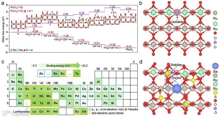 该研究提出了一种含氧阴离子保护机制。研究团队通过筛选出Ba锚定的硫酸盐来抑制晶格O的过度氧化。与此同时,通过W的引入降低了催化剂的反应过电位。这两者的综合作用有效提高了Ru基催化剂的酸性OER稳定性。这一研究为设计高稳定性催化剂提供了一种全新的视角和策略。