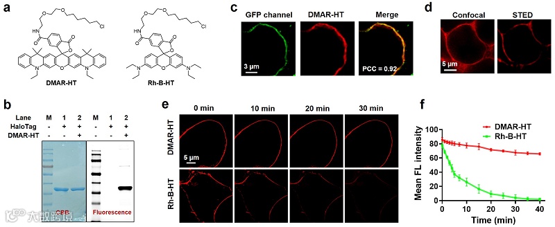 ,很好弥补了传统染料在光稳定性、光毒性、波长、亮度和Stokes位移多方面的缺点。DMA供体通过扩大染料的π共轭体系来实现波长红移;其相对刚性的结构有利于染料保持高量子产率;而特定的蝶形震动增加了分子的几何弛豫进而增大了Stokes位移;更重要的是,DMA供体有效抑制了染料分子形成三重态,并具有强的抗氧化能力,因而DMA基染料能对抗光降解,并降低对活细胞的光毒性。有意义的是,DMA适用于各类荧光染料家族,不仅包括罗丹明家族染料,还包括二氟硼络合物和香豆素衍生物等。通过DMA优化的罗丹明和香豆素染料对线粒体和脂滴进行双色标记,并在超分辨镜头下研究了它们长时间动态相互作用;通过对HaloTag标记的膜蛋白的STED成像,进一步证实了DMA染料优越的光稳定性以及在蛋白质长时间可视化成像中的重要应用。