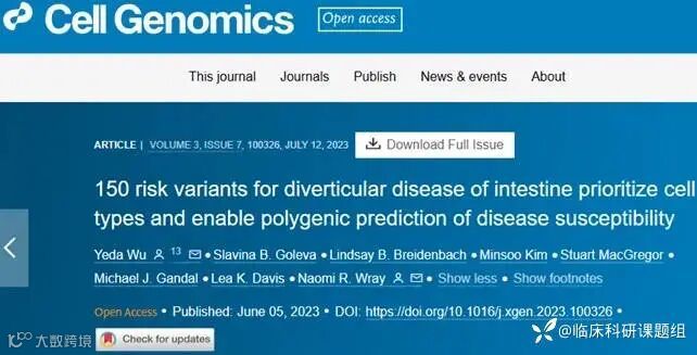 1.今年6月,一篇名为《150 risk variants for diverticular disease of intestine prioritize cell types and enable polygenic prediction of disease susceptibility》的研究通过Cell出版社的“一稿多投”服务在线发表。