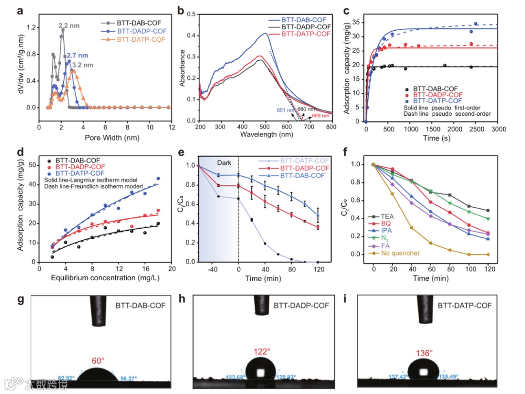 后,诱导DATP和亚胺键在骨架臂处自由旋转,在芳香和噻吩基序之间建立纵向和横向电荷转移通道。这种功能基元设计使得空穴驱动左氧氟沙星氧化发生在BTT区域界面,电子介导的氧还原产生活性自由基则发生在三联苯基元界面,更容易促进空穴与电子在空间上的平衡提取。在传质方面,BTT-DATP-COF优异的纳米孔道促进了污染物分子向反应中心输送,内外表面的疏水性有利于亲水副产物从材料内表面脱落并返回水相,释放材料表面的活性位点,具有一定自清洁能力和表面更新能力。该研究为基于有机多孔网络协同调节电子结构和界面反应提供了一条节能降耗的水净化途径。