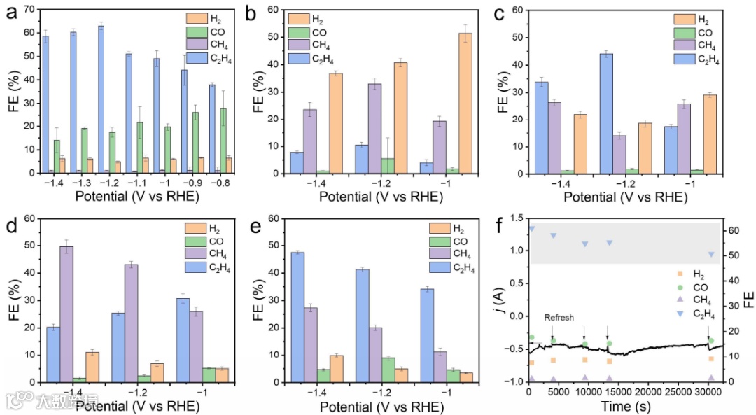 图2. 不同施加电势下催化剂获得的各种气体还原产物的FE(a)TA-Cu、(b)Cu NPs、(c)TA+Cu、(d)Cu2O、(e)TA+Cu2O。(f)TA-Cu电解CO2的稳定性。