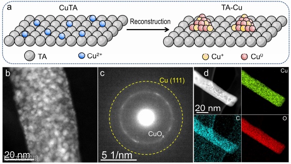 图1. (a) CuTA的电化学重构制备TA-Cu。TA-Cu的表征,(b) AC HAADF-STEM图像,(c) SAED,(d) EDS元素映射。