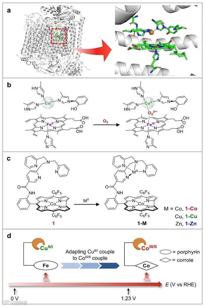 电催化氧还原反应(ORR)在燃料电池和金属空气电池中扮演着重要的角色。开发高效的四电子电催化氧还原催化剂受到广泛的关注。细胞色素c氧化酶(CcOs)可以在细胞呼吸中催化氧气还原为水。氧气首先在CcOs的血红素/Cu位点结合并发生活化。FeIICuI可以与氧气结合形成FeIII过氧化物-CuII物种,然后通过O-O键的断裂来实现四电子的氧气还原反应。在这个过程中,CuI通过提供电子来协助氧气在血红素/Cu位点上的结合,并促进接下来的O-O键断裂。但是目前报道的Fe-卟啉/Cu模型配合物并没有表现出优异的电催化氧气还原性能。在生物体中,氧气的结合与活化需要在完全还原的FeIICuI位点上。但是,在电催化ORR中满足这一条件却比较困难。当电压开始从1.23 V vs RHE往负扫时,铜离子处于CuII状态,很难发挥CcOs中CuI的作用。