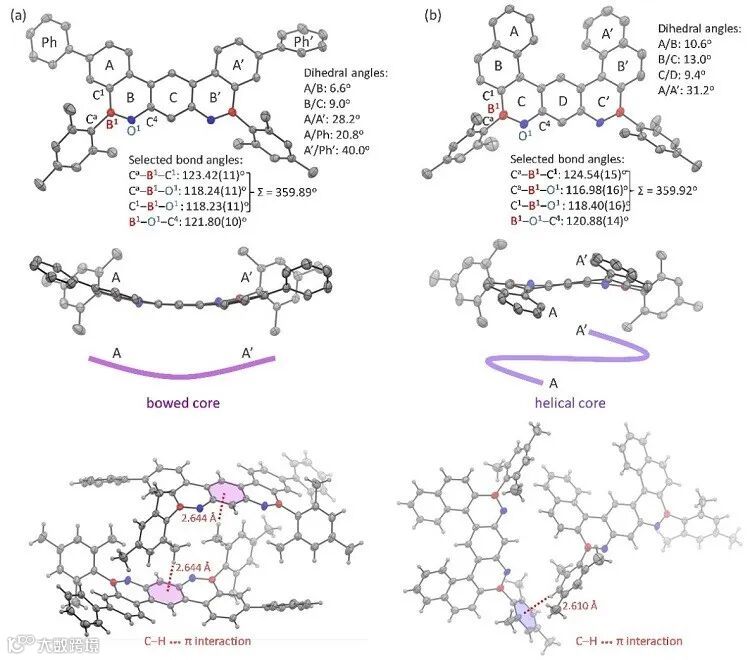 中双硼氧-嵌入的二苯并(A, J)蒽母核,不是平面而是弯曲构型,终端A和A '环之间的二面角为28.2°。此外,