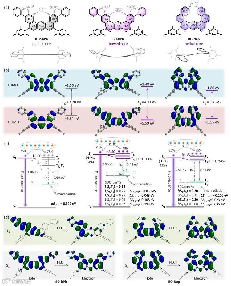 态之间的主跃迁构型和自旋轨道耦合(SOC)。(d)NTO计算的空穴和电子分布以及BO-bPh和BO-Nap代表性