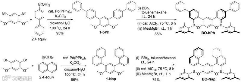 中 1/2和12/13位上引入两个苯基,以构建bPh和Nap单元作为弱给体,并增加其分子量。上述受体和给体通过中心苯环连接形成刚性和弱给受体(Donor-Acceptor)体系,并诱导弱分子内电荷转移(ICT)特性,从而增强了光电性能。此外,大位阻的2,4,6-三甲基苯基(Mes)不仅可以防止分子间聚集,还可以避免硼原子受亲核试剂的攻击,从而提高其化学稳定性。如图2所示,以2,4-二甲氧基-1,5-二(4-联苯)苯和2,4-二甲氧基-1,5-二(1-萘基)苯为原料,通过“一锅法”:脱甲基、亲电硼化和亲核取代反应,高效简便的两步合成