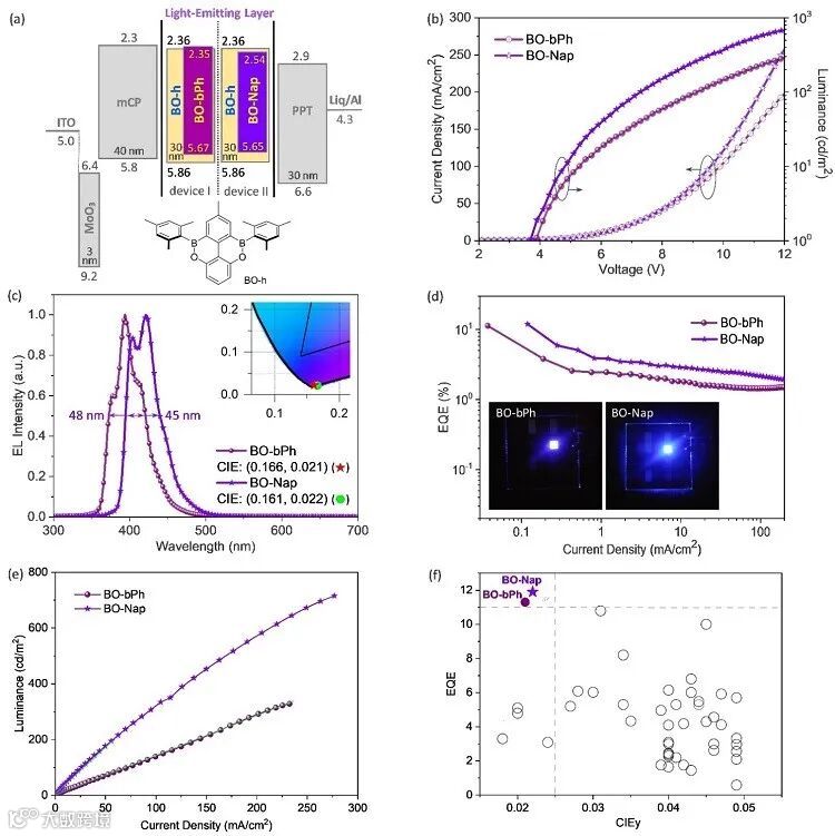 ) 特性。(f)已报道的代表性UV OLED的 EQEs和CIEy <0.05的比较(详见支持文件)。