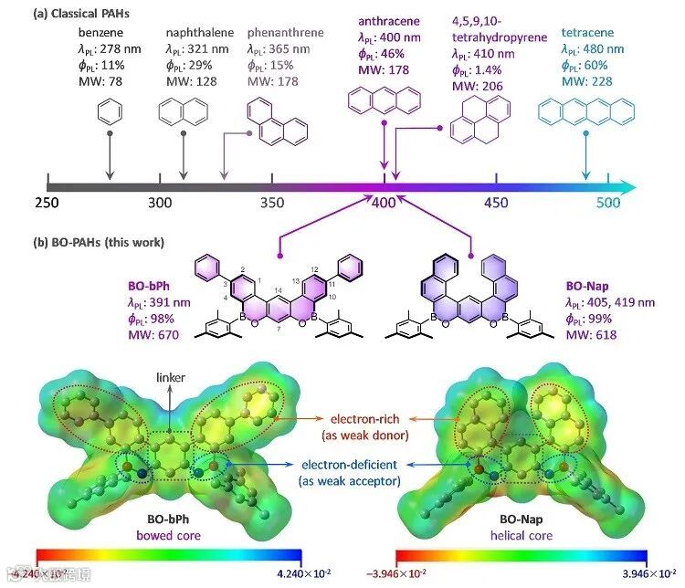 图1.(a)传统多环芳烃。(b)BO-bPh和BO-Nap的分子设计、结构和DFT计算的静电势图。