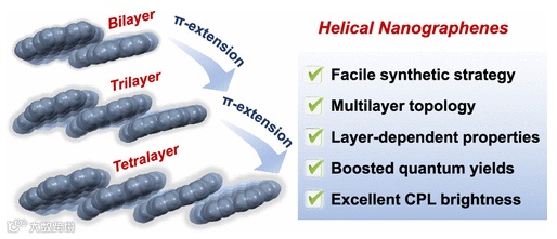 将多个螺烯平行嵌入纳米石墨烯中,制备了一系列结构新颖的螺旋多层纳米石墨烯,并揭示了它们层依赖的手性光学性质以及出色的圆偏振亮度。