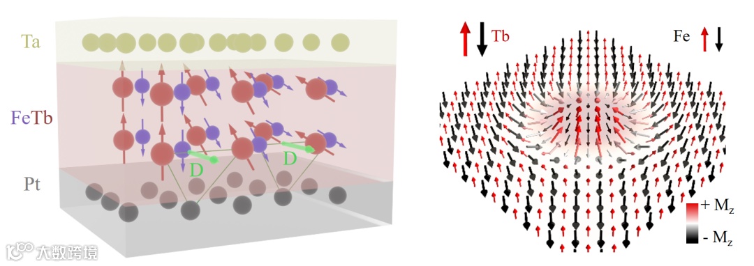 图一. 多层膜中的手性磁相互作用和奈尔型亚铁磁斯格明子。