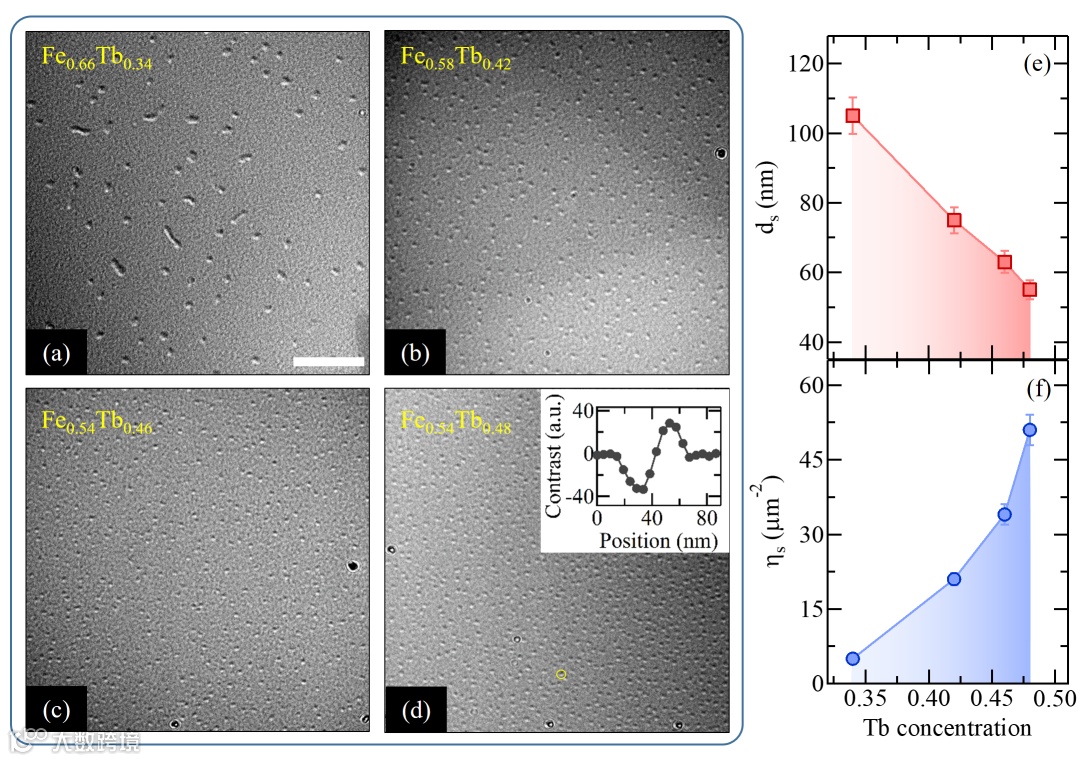 基于[Pt/Fe1-xTbx/Ta]n多层膜,研究团队通过调节Fe1-xTbx亚铁磁薄膜的组分,连续调控了材料的磁性参数。进一步借助磁透射X射线显微镜和洛伦兹透射电子显微镜,确定了奈尔型亚铁磁斯格明子的存在,并研究了其尺寸和密度的调控规律。实验结果显示,随着亚铁磁材料稀土元素成分增加,亚铁磁斯格明子尺寸不断减小,密度逐渐增大。该项研究为设计高性能亚铁磁斯格明子及其器件提供了新思路。
