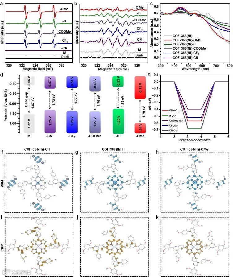 在COF-366(Ni)-R上的吸附能。(f,g,h)COF-366(Ni)-CN、COF-306(Ni)-H和COF-366(Ni)-OMe的VBM。(i,j,k)COF-366(Ni)-CN、COF-306(Ni)-H和COF-366(Ni)-OMe的CBM。在(a)、(b)和(d)中,M表示COF-366(Ni)。
