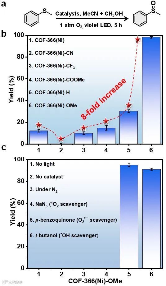 图4.(a)硫醚的光催化氧化制备苯基亚砜。(b)COF-366(Ni)和COF-366(Ni)-R光催化氧化硫醚的产率(图中的误差条表示相对标准偏差)。(c)COF-366(Ni)-OMe在不同反应条件下的光催化氧化硫醚的产率。