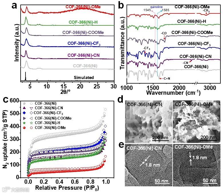 吸附等温线。(d)COF-366(Ni)-OMe和COF-366(Ni)-CN的SEM和(e)TEM图像。