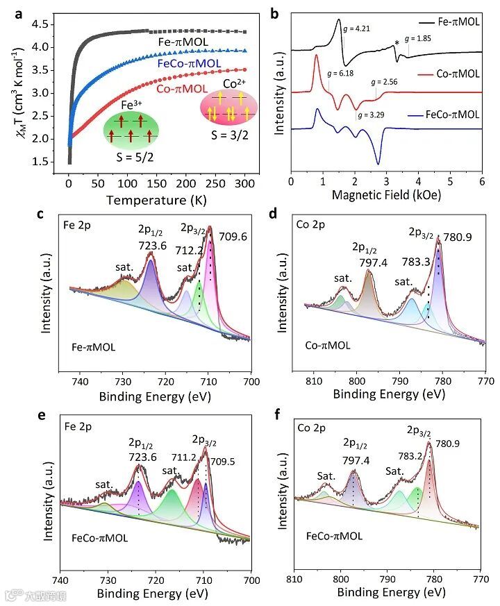图3. (a) Fe-πMOL、Co-πMOL 和 FeCo-πMOL 的变温磁化率。(b) 低温2K下的电子顺磁共振谱。(c-f) (c) Fe-πMOL 的 Fe 2p、(d) Co-πMOL 的 Co 2p、(e) FeCo-πMOL 的 Fe 2p 和 (f) FeCo-πMOL 的 Co 2p 的 XPS 光谱。