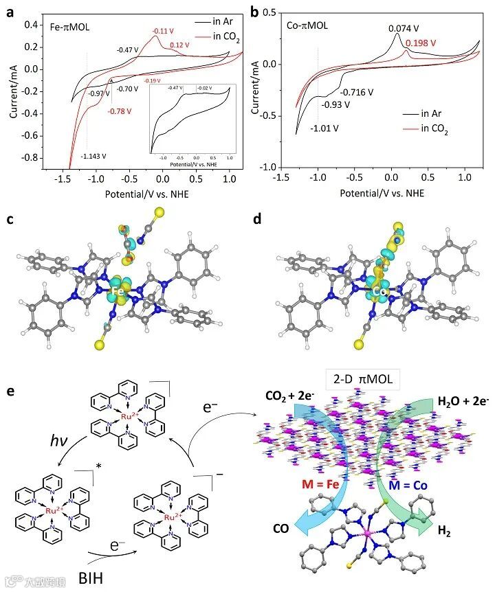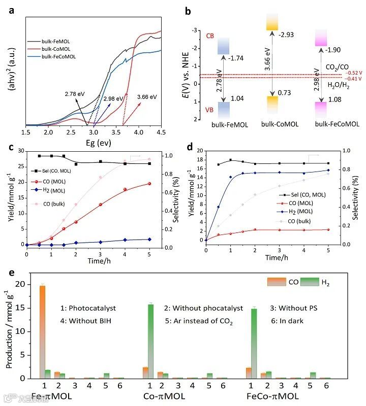 图4. (a) 由相应 DRS 得出的Tauc图。(b) MOL 催化剂的能带结构。 (c, d) (c) Fe-πMOL 和 (d) Co-πMOL 在光照射下产生的 CO(红色圆点)和