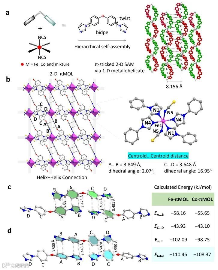图1. (a) π-粘结一维金属‒有机组装体的合成路线和晶体结构。(b) 二维自组装单层的晶体结构,通过苯基环和咪唑环之间的四重π...π相互作用形成棋盘状晶格,浅色网格为视线引导。右图为MOL 上催化活性位点的配位结构。(c、d) Fe-πMOL(c)和 Co-πMOL(d)中四重 π...π 相互作用的理论计算