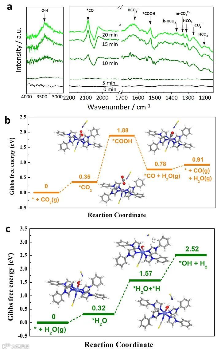 还原的原位傅立叶变换红外光谱。(b) 计算得出的 Fe-πMOL 上 C