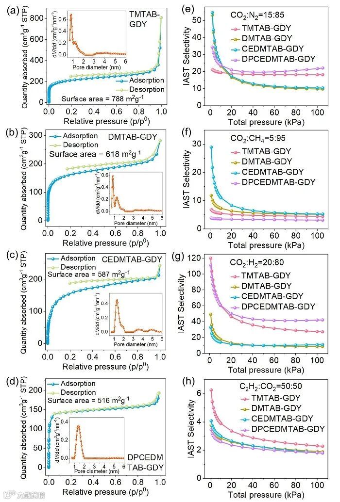 气体吸-脱附实验表明TAB-GDY具有较大比表面积和丰富的微孔结构,另外,由于TAB基团的缺电子性和乙炔键的富电子性,TAB-GDY在二元气体中表现出一定的IAST选择性。其中,DPCEDMTAB-GDY对