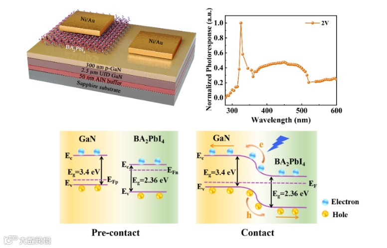 图2. BA2PbI4/GaN异质结PD结构图、归一化光谱响应以及能带示意图