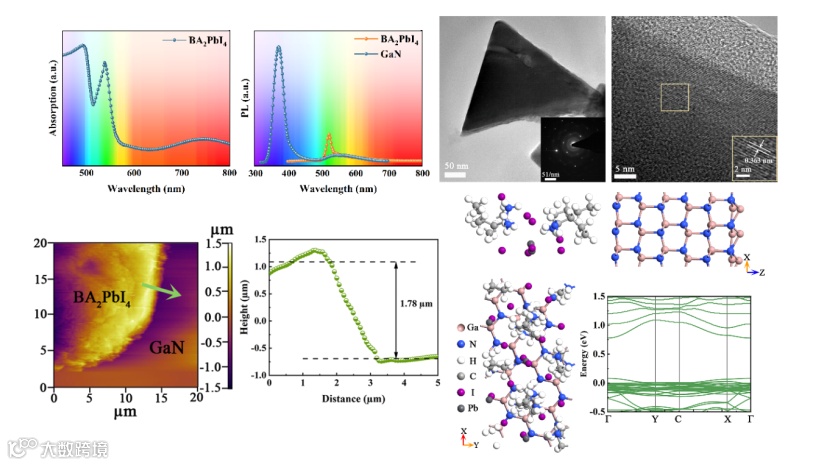 图1. BA2PbI4材料形貌、光学性能以及异质结AFM、模拟能带结构图