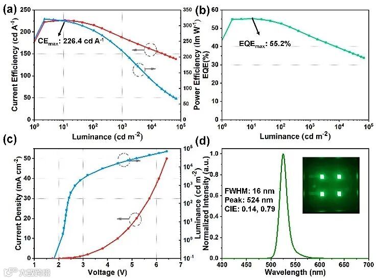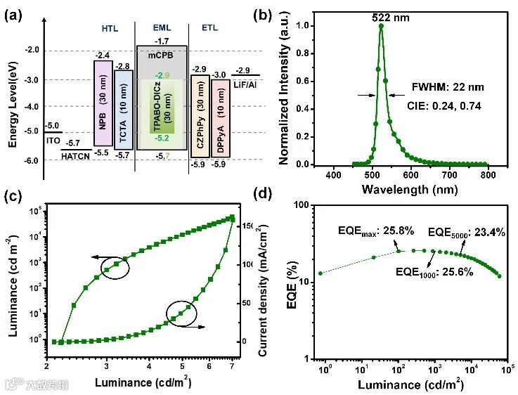 图4. TPABO-DICz的底发光器件:电流效率-电压曲线(a),EQE曲线(b),电流密度-亮度-电压曲线(c),EL光谱(d)。