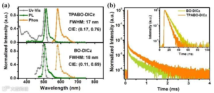 为了验证超纯绿光染料在实际应用中的潜力,该团队还进一步制备了TPABO-DICz的顶发光器件(图4)。受益于微腔结构有效的振动抑制,器件的半峰宽进一步缩减至16 nm,从而获得了几乎满足BT2020的纯绿光发射(CIE:0.14, 0.79)。更重要的是,上述器件实现了还实现了目前最高的电流效率,高达226.4 cd A-1,表明超高色纯度染料在构筑高能效顶发光器件的优势。此外,在初始亮度15524 cd m-2时,该顶发光器件的LT80的寿命可以达到223.2小时,表明TPABO-DICz具有很好的稳定性。